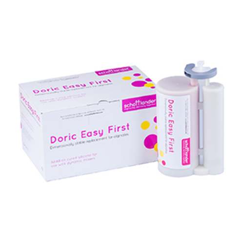 Alginate replacement material with all the advantages of a silicone Doric Easy First is specifically designed for use where previously you may have used alginate. Doric Easy First has a snap set of only 2 minutes 30 seconds in the mouth. It is supplied in the easy to use Doric Easy Cartridge System for fully automatic mixing in the Doric Easy mixer and is also compatible with all automatic impression mixers. Its applications therefore include full or partial dentures, chrome dentures, temporary crown matrices, study or master models, orthodontic impressions and those for bleaching trays and mouthguards. Its addition cured silicone technology gives high elasticity, imensional stability and recovery from deformation at 99.3%, so you can pour a second model even after several weeks - an important safeguard when making temporary crowns. With an ideal working time and a short snap set you will have an impressed patient too. It has an ideal consistency with no powder or water to measure out. No bowls or spatulas to clean or messy powder everywhere. Doric Easy First can be disinfected with all standard solutions.